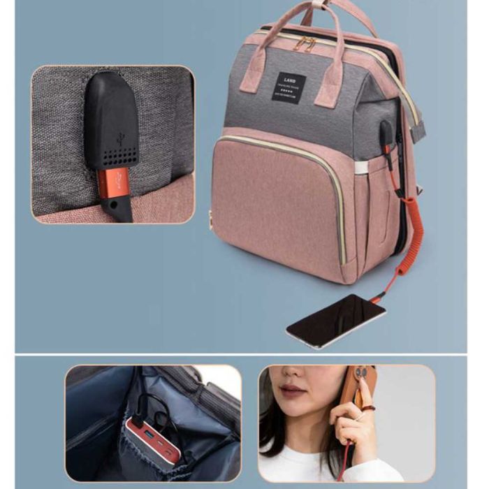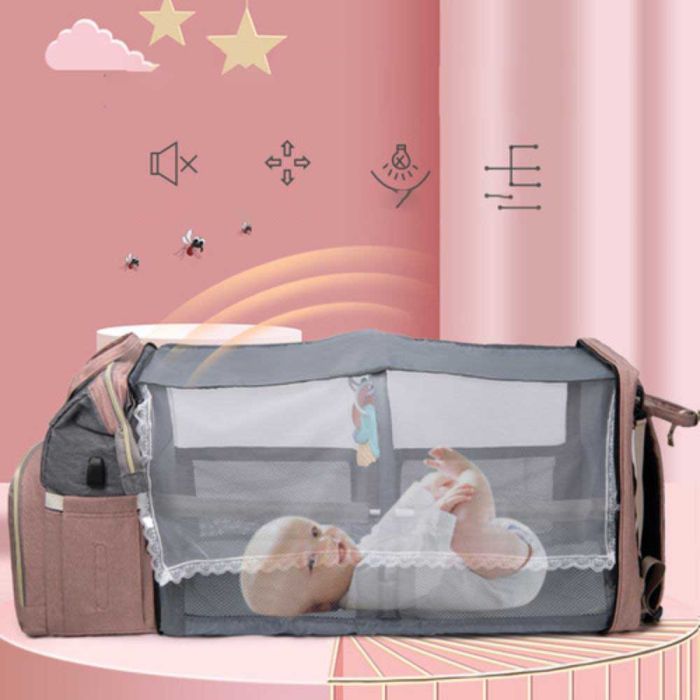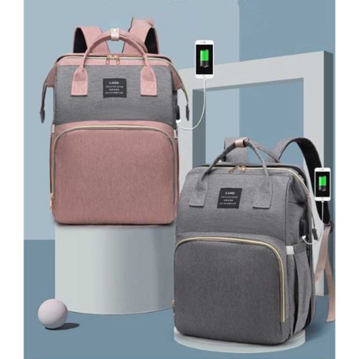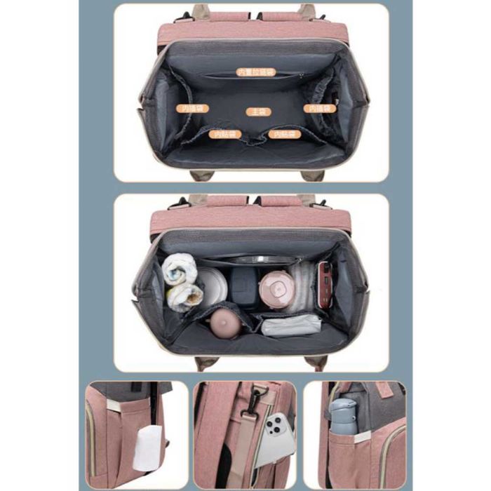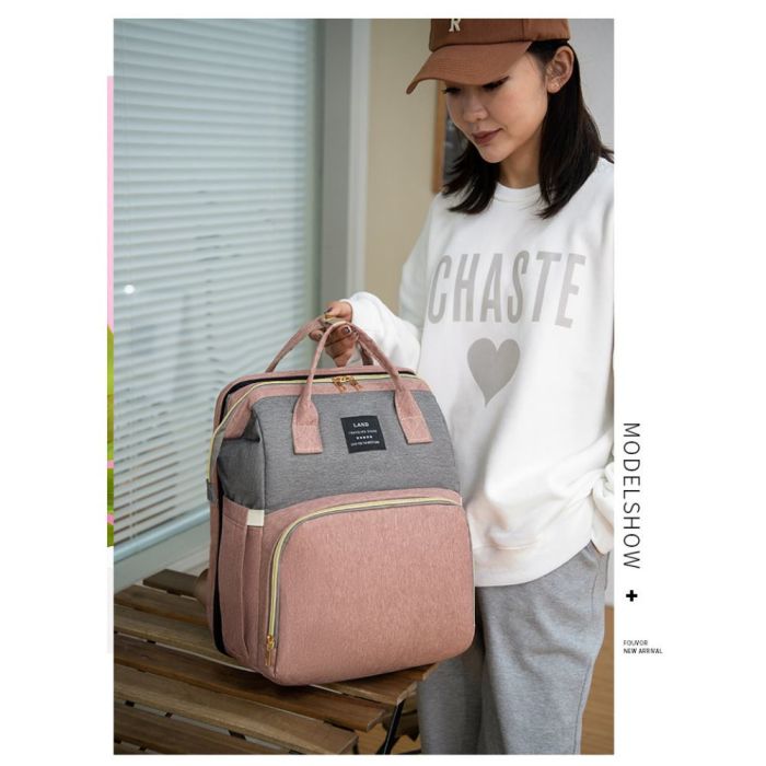 حقيبة ظهر للأم بسرير قابل للطي للرضع مصنوعة من أكسفورد مقاوم للماء، تصميم عصري بسعة كبيرة وتنظيم ذكي، مزودة بسرير مدمج يوفر مساحة مريحة للرضيع، مثالية للرحلات والخروج اليومي وتحافظ على جودتها مع الاستخدام المتكرر