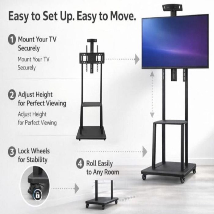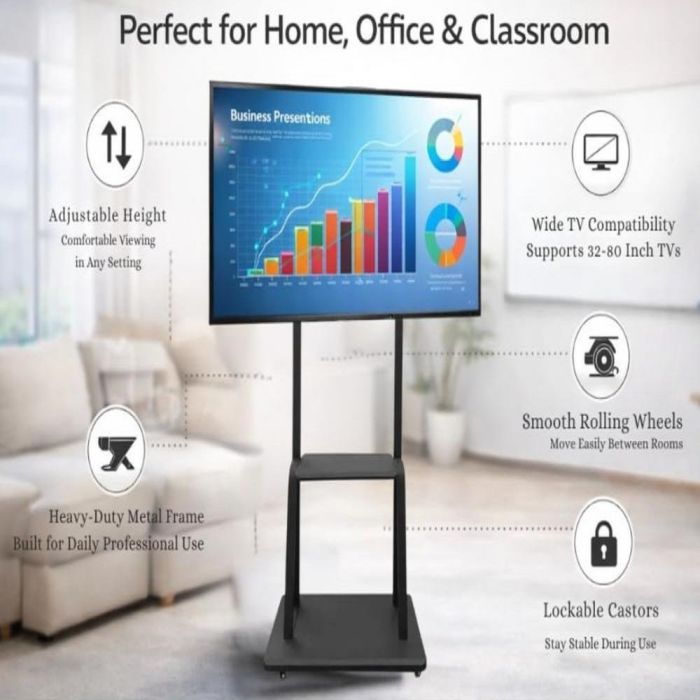 الرفيق الأمثل لتلفزيونك. ستاند تلفزيون متحرك يتميز بإطار قوي وهيكل معدني متين، حيث يوفر قاعدة آمنة لتلفزيونك حتى 80 بوصة بفضل قدرته العالية على تحمل الأوزان، كما أنه مزود بعجلات مع قفل وأرفف مزدوجة للإكسسوارات