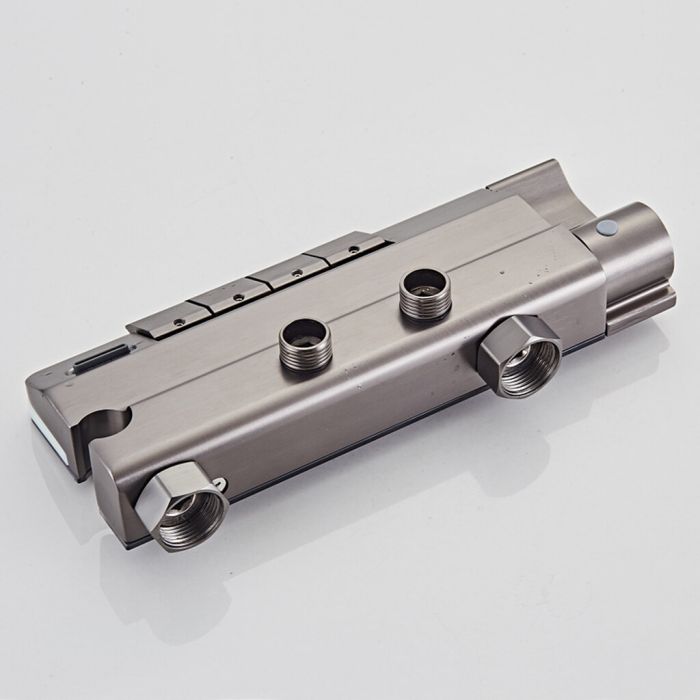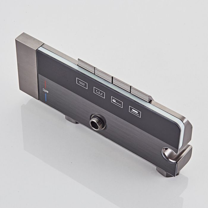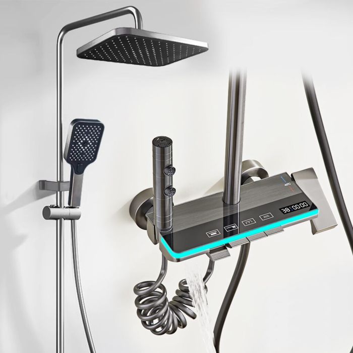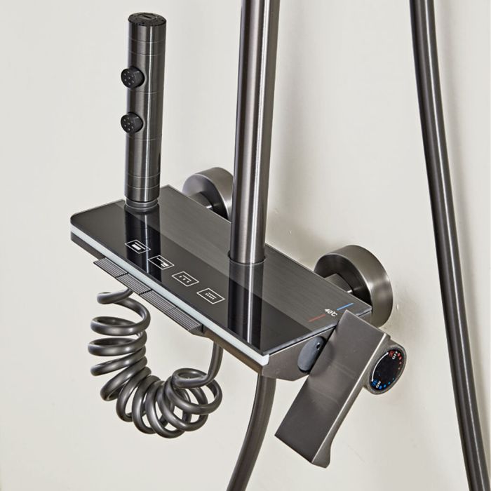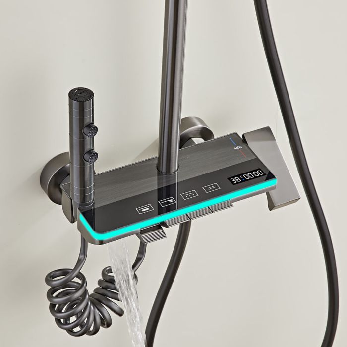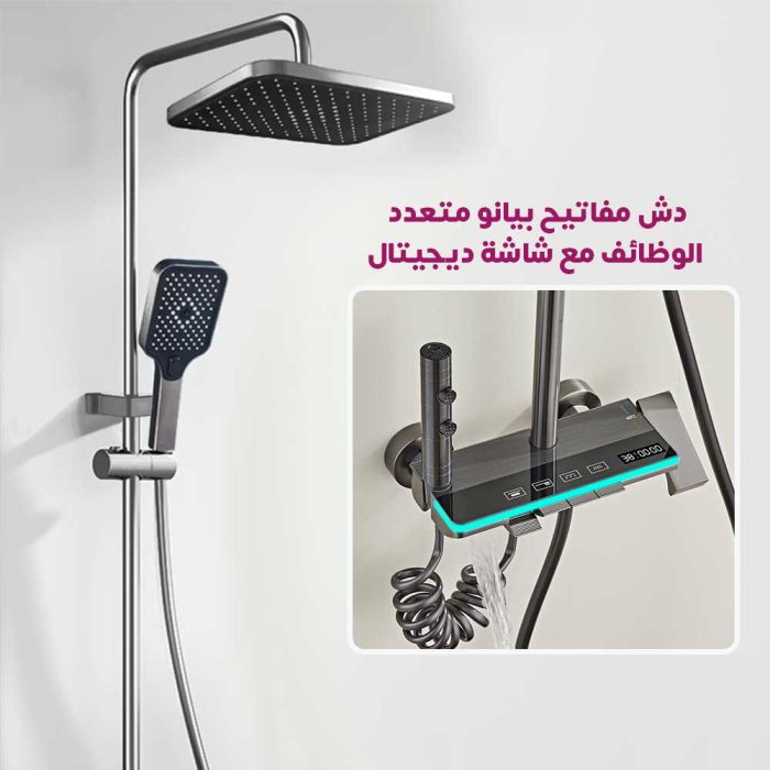 يتميز نظام الدش الأنيق بخلاط بارد وساخن، رأس دش علوي، رأس دش يدوي مع قاعدة، رشاش يدوي صغير مع قاعدة مع مخرج مياه مخفي في الأسفل، جميعها يتم التحكم فيها بأزرار سهلة الاستخدام. استمتع بتجربة دش وتدليك تشبه السبا في منزلك، مع سهولة التركيب وطرق متعددة لمخرج المياه