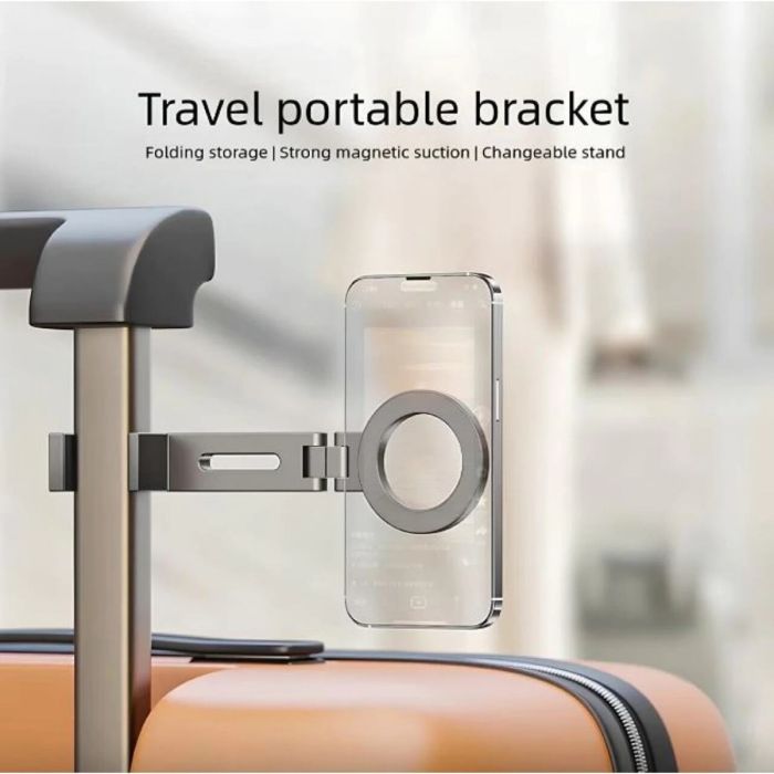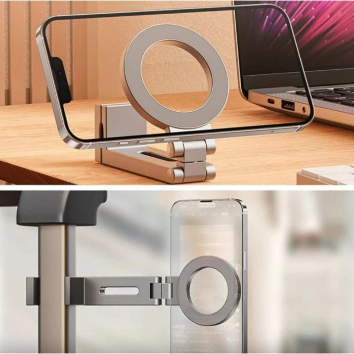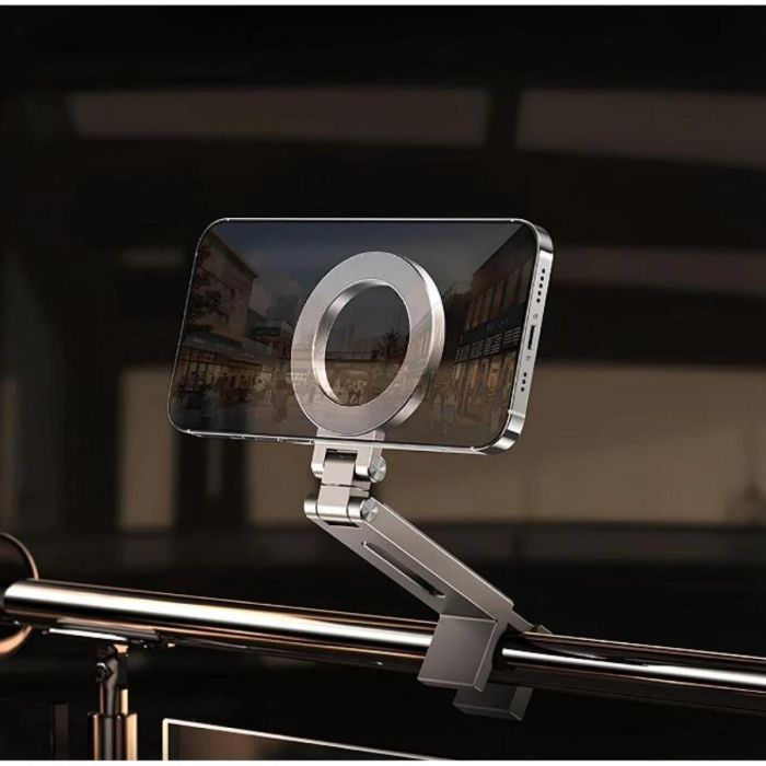 مسند مغناطيسي قابل للطي مصنوع من سبائك الزنك والبلاستيك المقوى والسيليكون، يجمع بين المتانة والأناقة. مزود بمغناطيس قوي من نوع N52 لتثبيت آمن للأجهزة المتوافقة مع MagSafe. يثبت بسهولة على المكاتب أو طاولات الطائرات أو إطارات الأسرة أو أي سطح بسماكة تصل إلى 40 مم. قابل للدوران والتعديل بالكامل لراحة المشاهدة بوضعية أفقية أو عمودية. تصميم مدمج وخفيف الوزن، مثالي للسفر أو المكتب أو الاستخدام المنزلي.