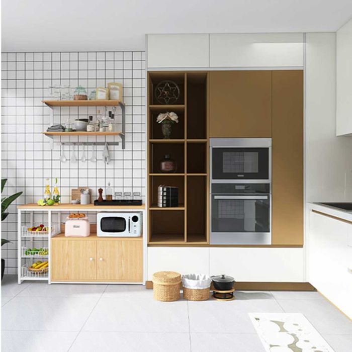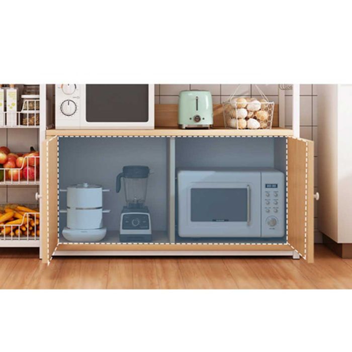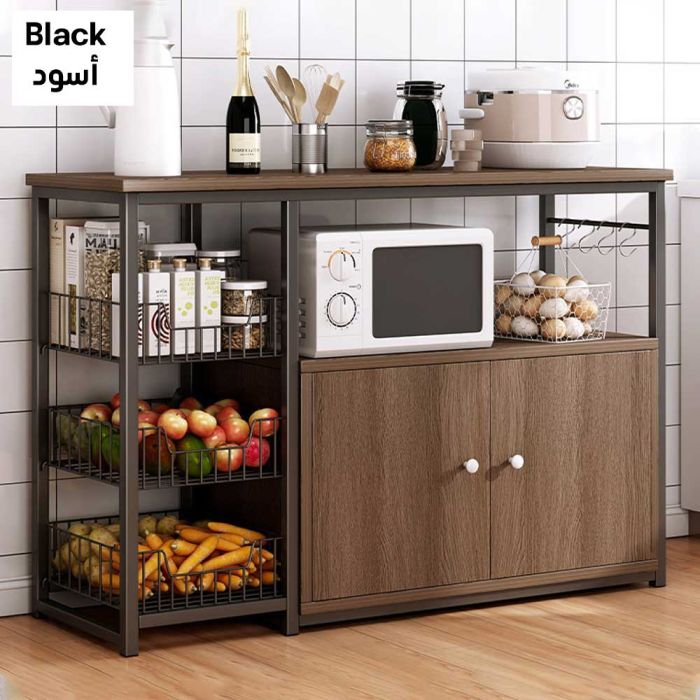 منظم مطبخ متعدد الإستخدامات متعدد الطبقات مع أبواب مصنوع من سطح خشبي وهيكل معدني، يمنحك ترتيب ذكي لأجهزتك وأغراضك اليومية، يساعدك على استغلال المساحة براحة، ويضيف مظهراً أنيقاً ومنظماً لمطبخك