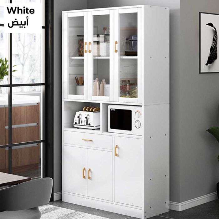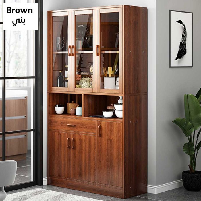 منظم خشبي متعدد الطبقات مع درج وأبواب بتصميم أنيق يساعدك على ترتيب المطبخ أو غرفة الطعام بذكاء، يوفر مساحة منظمة لتخزين الأدوات والأواني، مع جزء مخصص لوضع الأجهزة، ليمنحك ترتيباً متناسقاً ولمسة راقية في منزلك