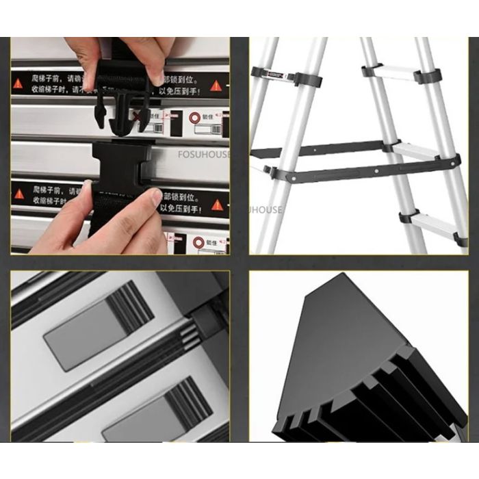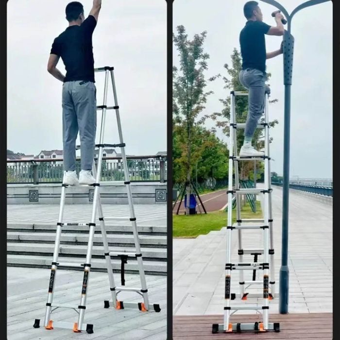 سلم تلسكوبي قابل للطي متعدد الوظائف لا يحتاج إلى تجميع، مكون من أقسام متعددة ومزود بنظام مفصلي آمن وسهل القفل، فقط قم بفتح المفصل لتغيير الشكل المطلوب للسلم، كما يتم قفل المفصلة تلقائيًا بعد كل تغيير في الوضع حتى تتمكن من استخدامه بعدة طرق كسلم قائم على الحائط، يتحمل حتى وزن 150 كجم، يمكنك استخدامه للوصول إلى السقف، وتنظيف النوافذ، والطلاء الداخلي والخارجي والديكور، كما يمكنك تخزين السلم القابل للتمدد تحت السرير أو خلف الخزانة أو الأبواب