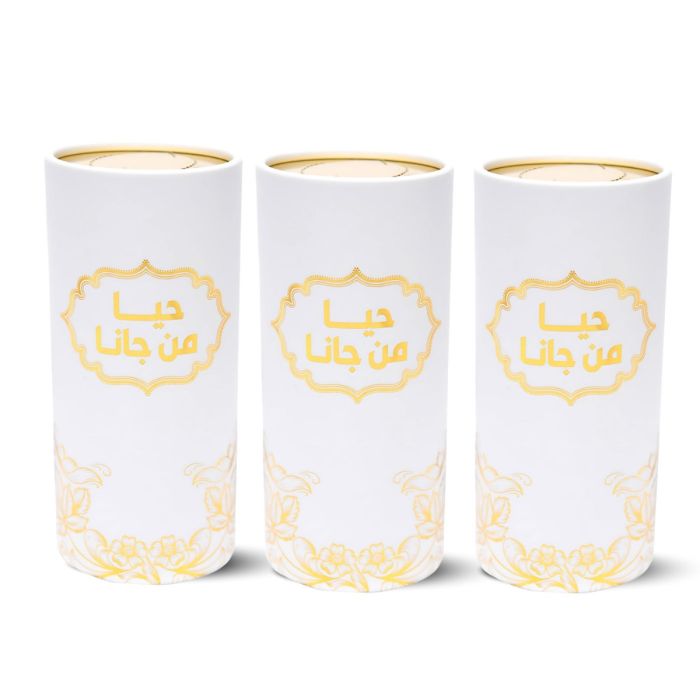 - مطبوعة برقائق معدنية ذهبية لامعة على ورق سميك، مما يعطي ملمساً ساتانياً ولامعاً