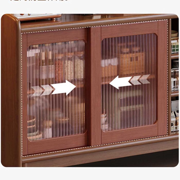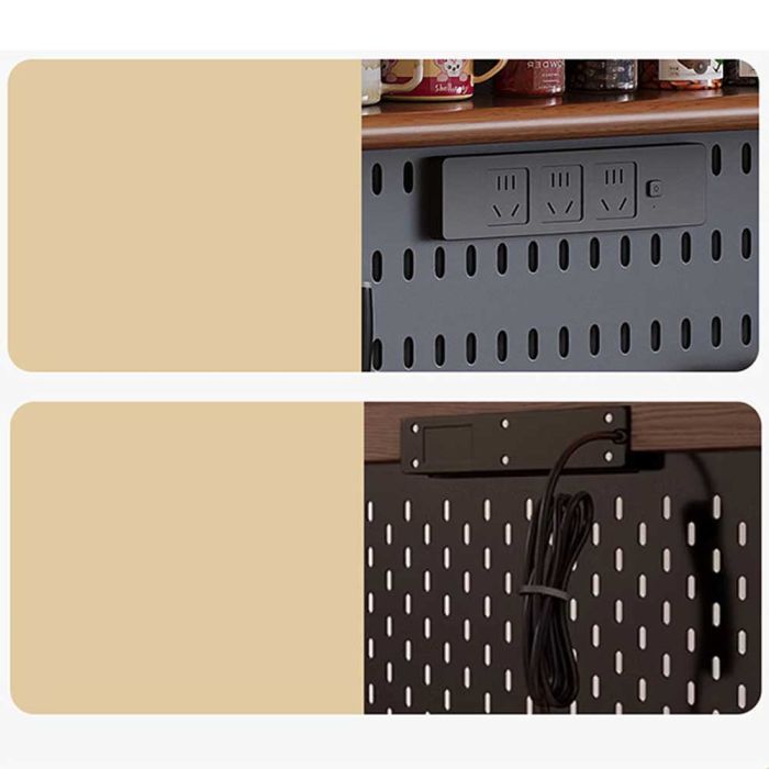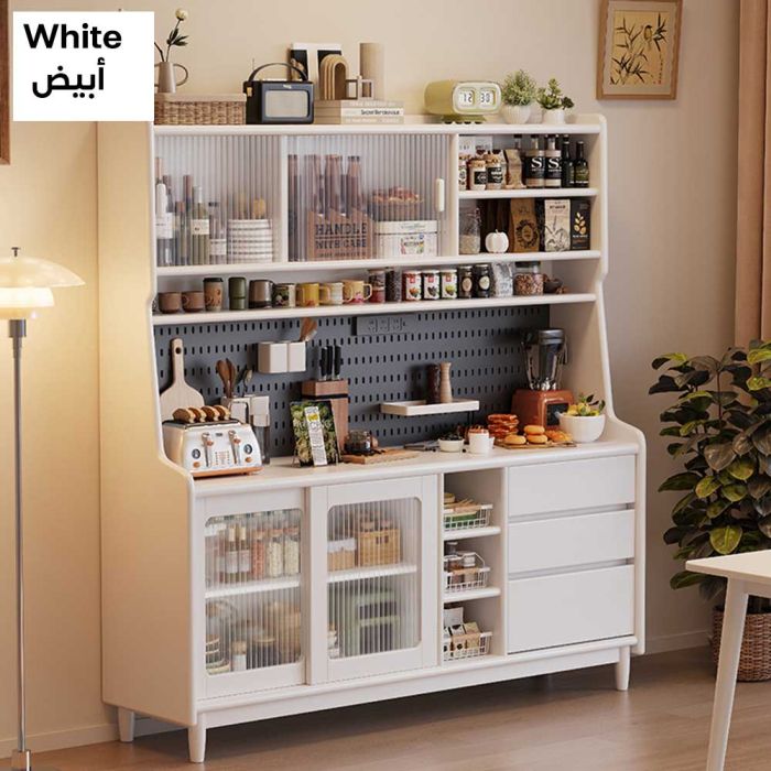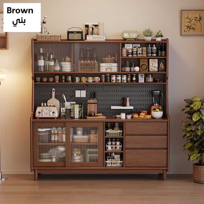 منظم خشبي متعدد الطبقات مع أبواب وأدراج مصنوع من خشب عالي الجودة مع أبواب زجاجية منزلقة، تصميم يجمع بين التخزين المغلق والمفتوح، يوفر مساحات مرتبة لعرض الأدوات وتنظيم مستلزمات القهوة والمطبخ بأسلوب أنيق ومتوازن