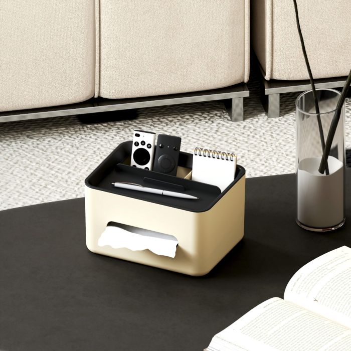 علبة مناديل مكتبية مصنوعة من بلاستيك متين، تصميم أنيق يضفي لمسة فاخرة على الطاولة، توفر مساحة منظمة للمناديل وأجهزة التحكم والإكسسوارات، فتحه عريضة لسحب سلس وتحافظ على ترتيب المساحة