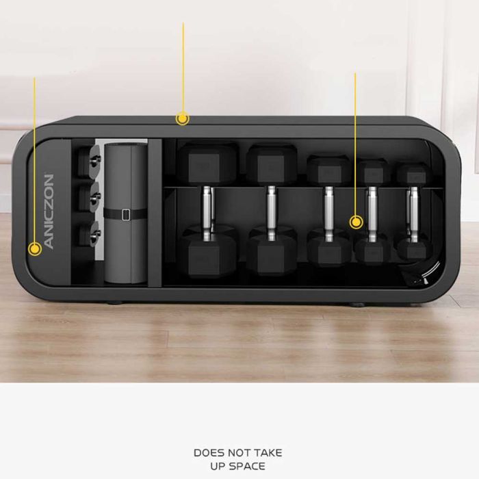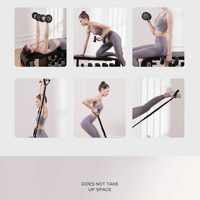 - مزودة بمساحة تخزين داخلية منظمة للدمبلز وحبال المقاومة