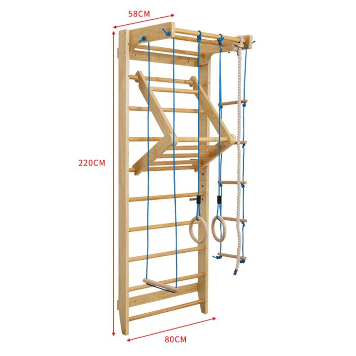 إطار تسلق خشبي متعدد الإستخدامات يوفر مساحة آمنة للتسلق وتمارين التوازن والإطالة، ويتميز بهيكل قوي يمنح ثباتًا عاليًا، مع حلقات معلّقة وسلّم حبال ولوح انزلاق لدعم تنمية القوة والمرونة، مما يجعله محطة تدريب شاملة تناسب الأطفال داخل المنزل.