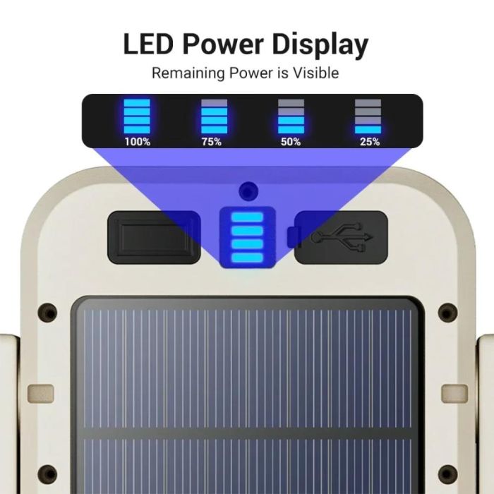 - شحن مزدوج: بالطاقة الشمسية أو عبر منفذ Type-C