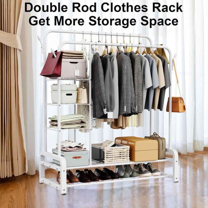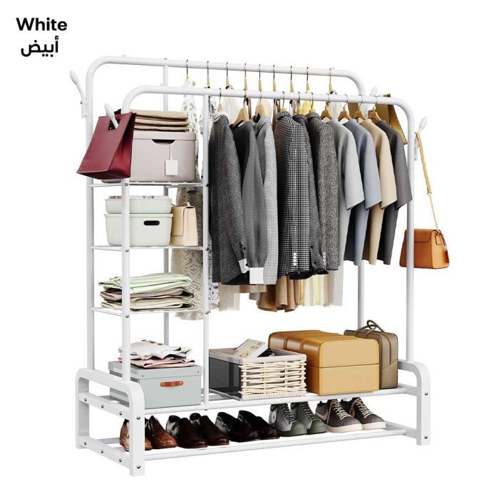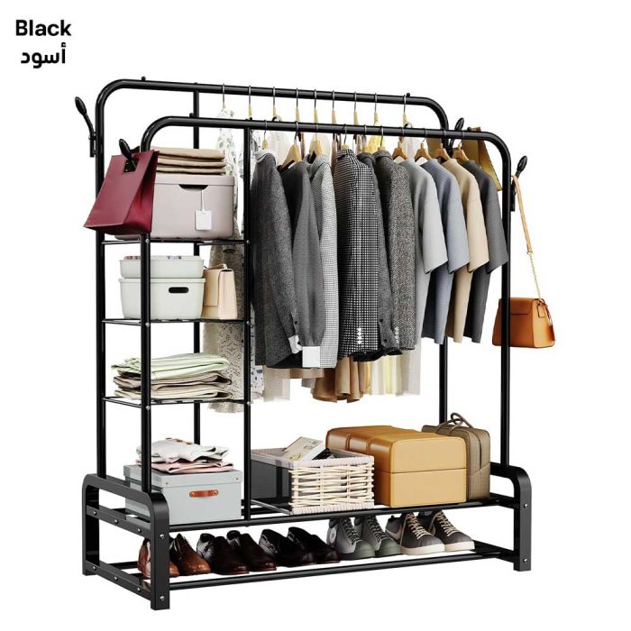 اكتشف مستوى جديداً من التنظيم مع رف الملابس العصري. مصنوع من معدن شديد التحمل، كما يعمل تصميمه متعدد الوظائف على زيادة كفاءة المساحة إلى أقصى حد، حيث أن تصميمه الأنيق والعصري يجعله إضافة رائعة لديكور منزلك ويمكنك وضعه في الممرات والغرف، مصمم بـ 4 طبقات من الأرفف لتناسب الأحذية، الأغراض كبيرة الحجم، الصناديق، الكتب والتحف. كما أنه مزود بقضبان مزدوجة مع 4 علاقات للملابس والمعاطف والقبعات