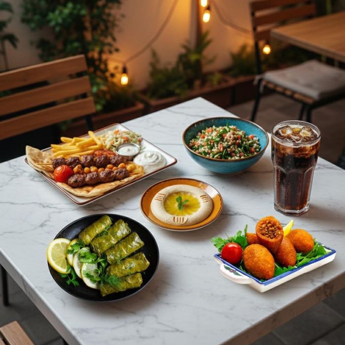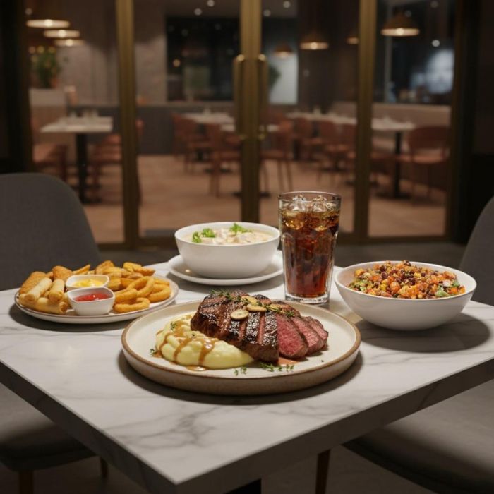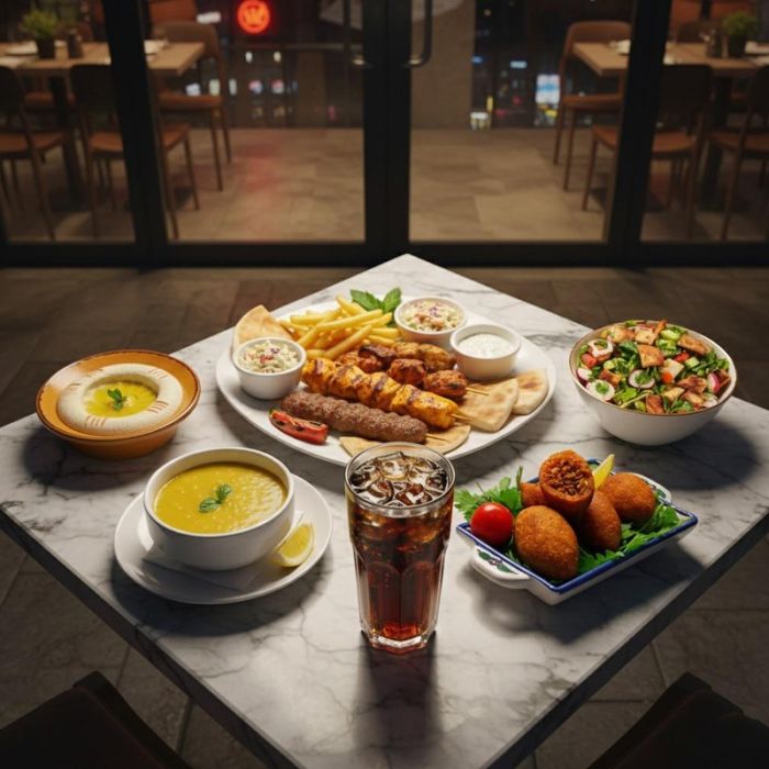 اختر من بين: شريحة لحم مع بطاطا مهروسة، شوربة دجاج، سلطة كينوا، طبق مشكل ساخن، كيك، ومشروب غازي واحد. أو: مشاوي مشكلة، شوربة عدس، فتوش، حمص، كبة لحم، كيك، ومشروب غازي واحد.