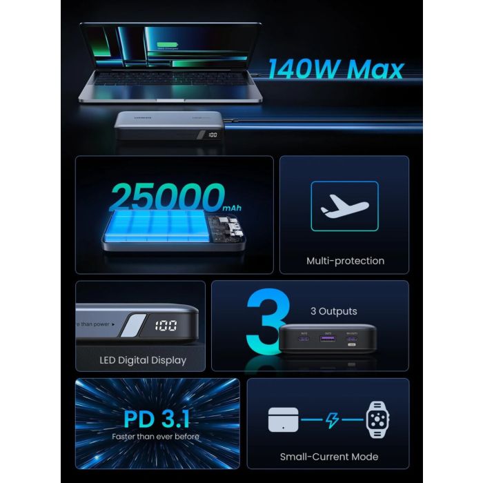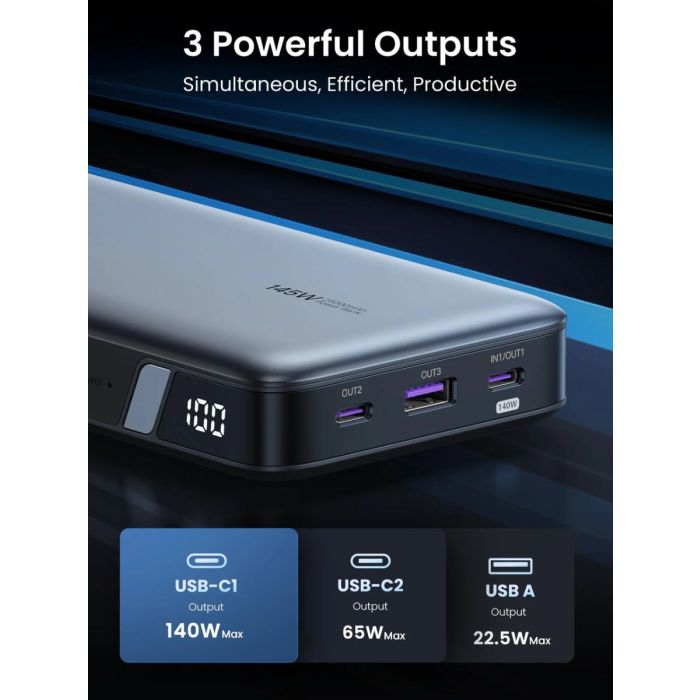 تتميز هذه البطارية بسعة ضخمة 25000 مل أمبير وشحن سريع بقوة 145 واط، مما يضمن أن تكون أجهزتك جاهزة على الدوام. مع تقنيات PD3.1 و QC3.0، والتي توفر شحناً سريعاً ثنائي الاتجاه وتوافقاً واسعاً. كما تبقيك الشاشة ديجتال الذكية على اطلاع بحالة الطاقة، ويضمن تصميمها القوي المتانة والاستخدام طويل الأمد