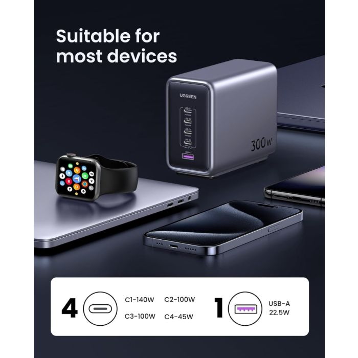 - شاحن مكتبي سريع نيكسود قوة 300 واط 5 منافذ PD UK من UGreen