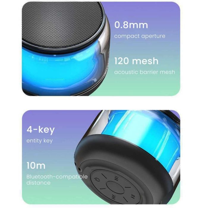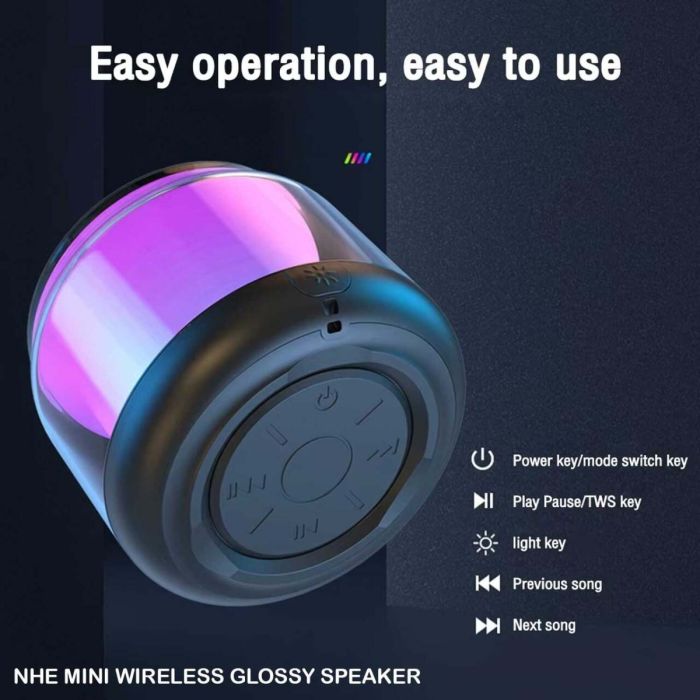 مكبر الصوت اللاسلكي الصغير من NHE المزود بإضاءة RGB هو مكبر صوت أنيق يجمع بين الصوت عالي الجودة والإضاءة RGB النابضة بالحياة. إنه مثالي لمحبي الموسيقى الذين يريدون مزيجًا بين الأداء والجاذبية البصرية.