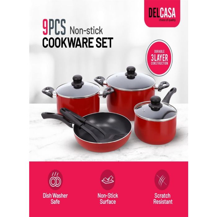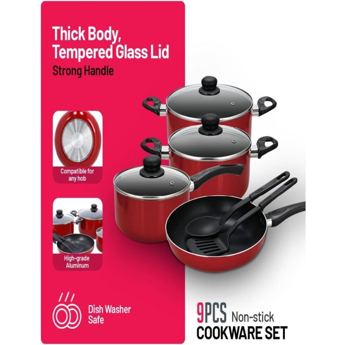 طقم أواني طهي غير لاصق مكون من 9 قطع - أحمر