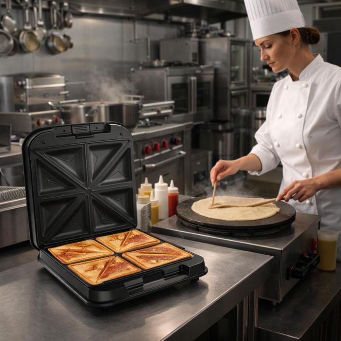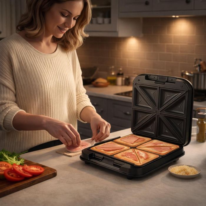 جهاز عملي وسريع لتحضير 4 ساندويتشات في دقائق، مع قدرة عالية وتصميم أنيق يناسب أي مطبخ. مناسبة للاستخدام اليومي في المنزل أو المكتب