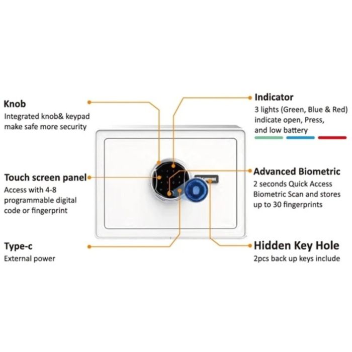 توفر خزنة أوركا الذكية مستوى أمان متقدم بفضل نظام القفل المزدوج (رقمي + بصمة). تأتي بتصميم متين باستخدام تقنية القطع بالليزر لتقليل الفواصل وزيادة الأمان. كما تتميز بحواف دائرية آمنة وتصميم داخلي مبطن بالكامل لحماية المحتويات. في حالات الطوارئ، يمكن فتحها باستخدام مفتاح احتياطي أو مصدر طاقة خارجي، مما يضمن سهولة الاستخدام في جميع الظروف.