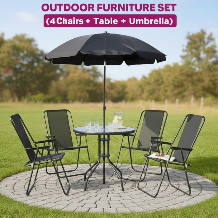 ارتقي بمساحتك الخارجية مع طقم الجلسة الأنيق، يحتوي على مظلة مقاومة للرياح، و4 كراسي، وطاولة بسطح زجاجي، مما يضفي لمسة من الأناقة على أي حديقة أو فناء