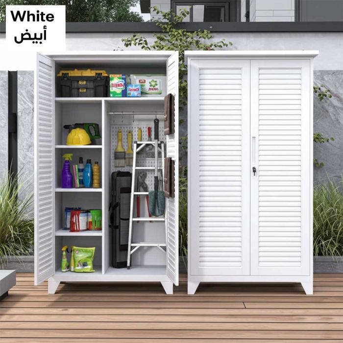 خزانة تخزين خارجية معدنية بأبواب شرائح للحديقة مصنوعة من معدن متين، تمنح مظهراً أنيقاً وتنظيماً مثالياً، مناسبة للاستخدام الخارجي، توفر حماية ممتازة للمحتويات، تصميمها مريح ومتعدد الاستخدام، وتحافظ على جودتها مع الاستعمال