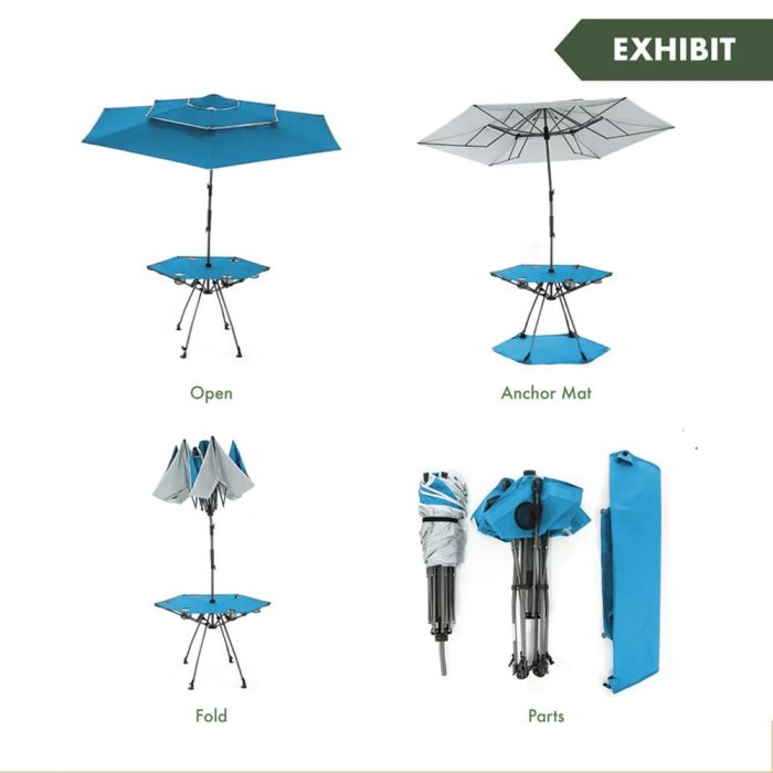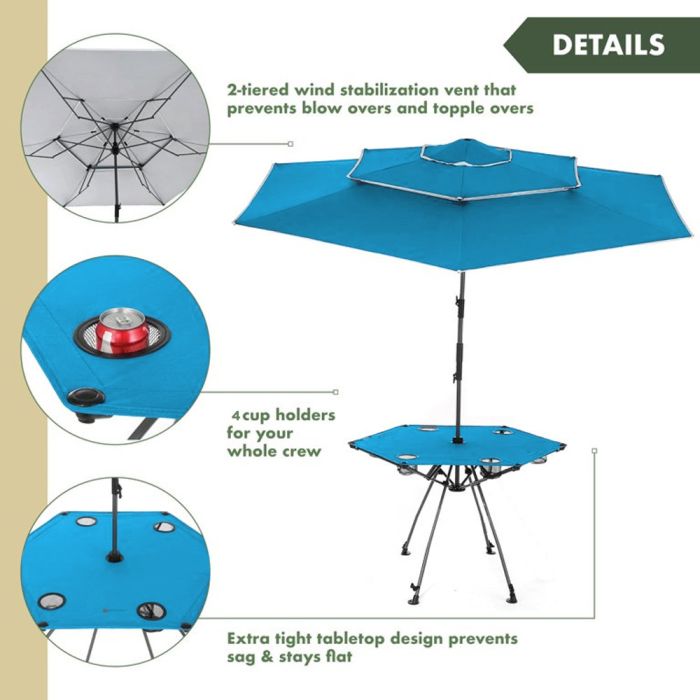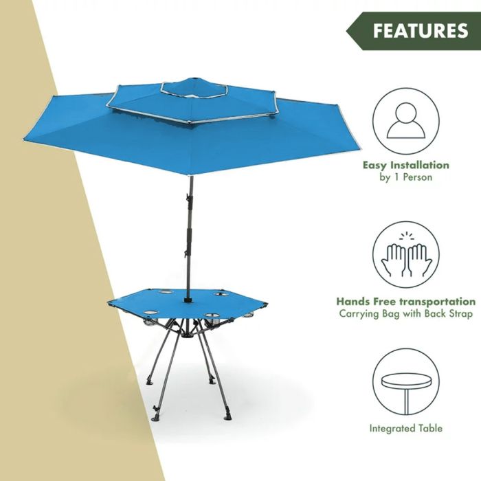 استمتع بوقتك في الهواء الطلق مع مظلة شمسية محمولة تحميك من الأشعة فوق البنفسجية الضارة، وتأتي مع طاولة قابلة للطي مع 4 قاعدة أكواب، وحقيبة ظهر لسهولة النقل. احمِ نفسك وعائلتك من أشعة الشمس الحارقة واستمتع بالهواء الطلق مع هذه المظلة المحمولة والعملية.