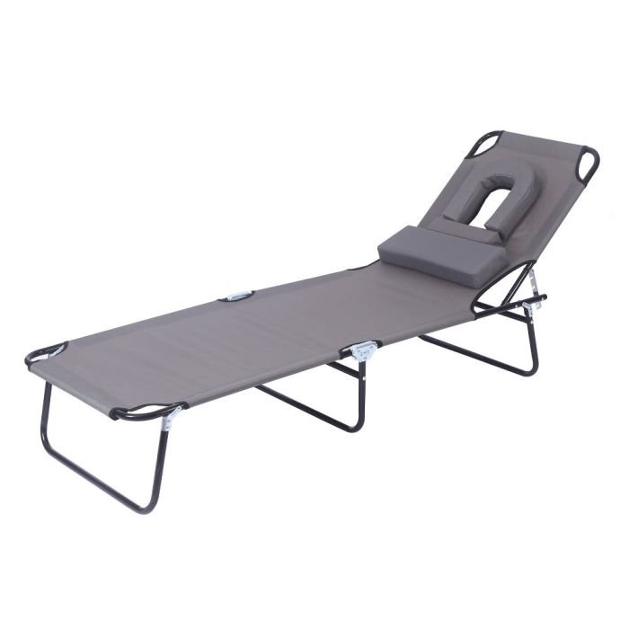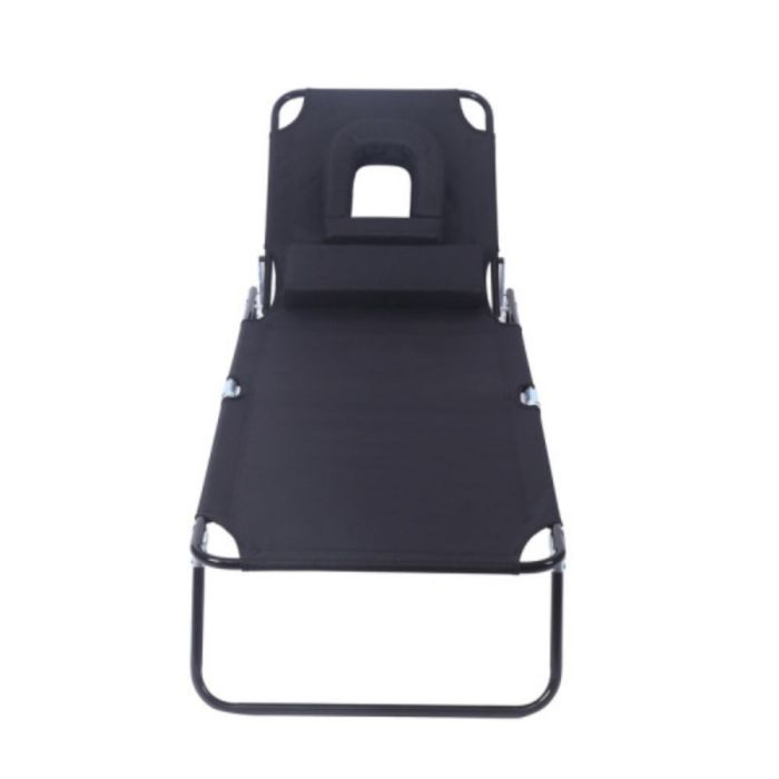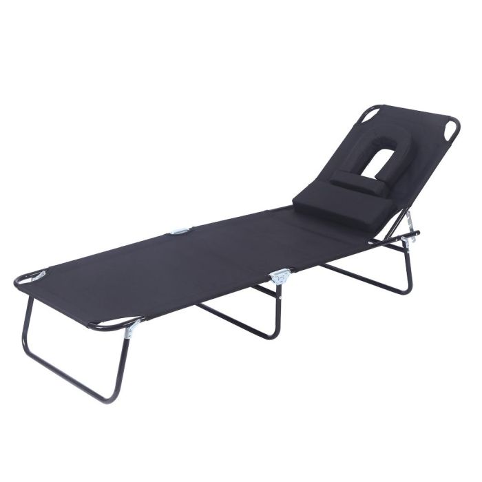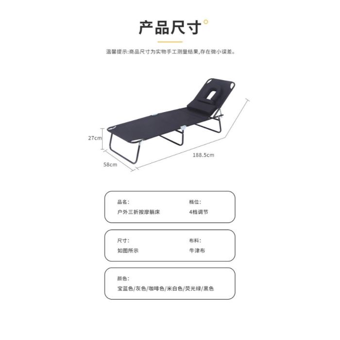سرير استرخاء خارجي ثلاثي الطي بهيكل فولاذي مصنوع من خامة متينة قابلة للتهوية، يوفر راحة مثالية مع مسند ظهر بأربع مستويات، تصميم قابل للطي لسهولة التخزين والنقل، قدرة تحمل قوية للاستخدام الخارجي