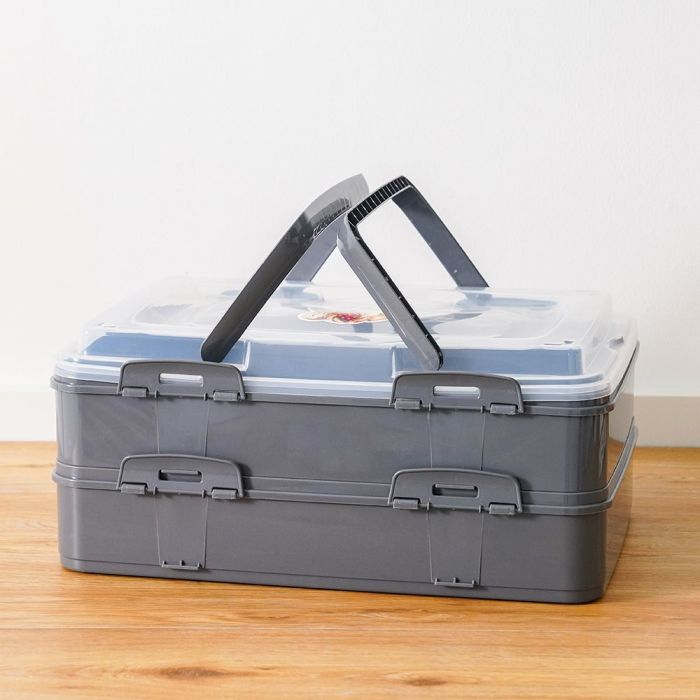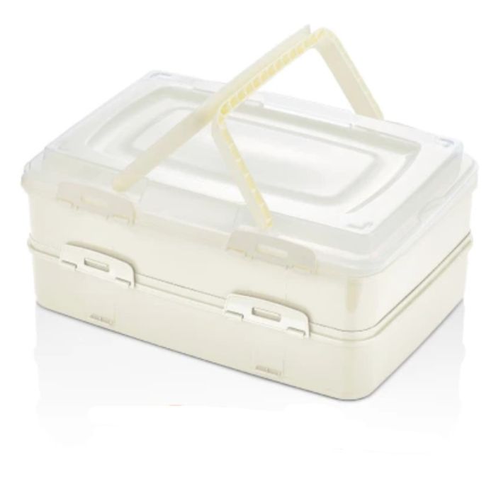 انقلي المعجنات والمخبوزات بأمان مع هذه الحافظة المزدوجة. تتميز بطبقتين واسعتين قابلتين للتخزين، مما يتيح تنظيم وحمل الكعك أو المعجنات أو الوجبات الخفيفة بشكل آمن. الغطاء الشفاف يوفر رؤية واضحة ويحافظ على المحتويات. مصنوع من بلاستيك متين وآمن غذائيًا، وخفيف الوزن وسهل التنظيف، مما يجعله مثاليًا. يتميز بمقبض مريح ونظام إغلاق محكم لضمان النقل الآمن دون انسكاب أو تلف.