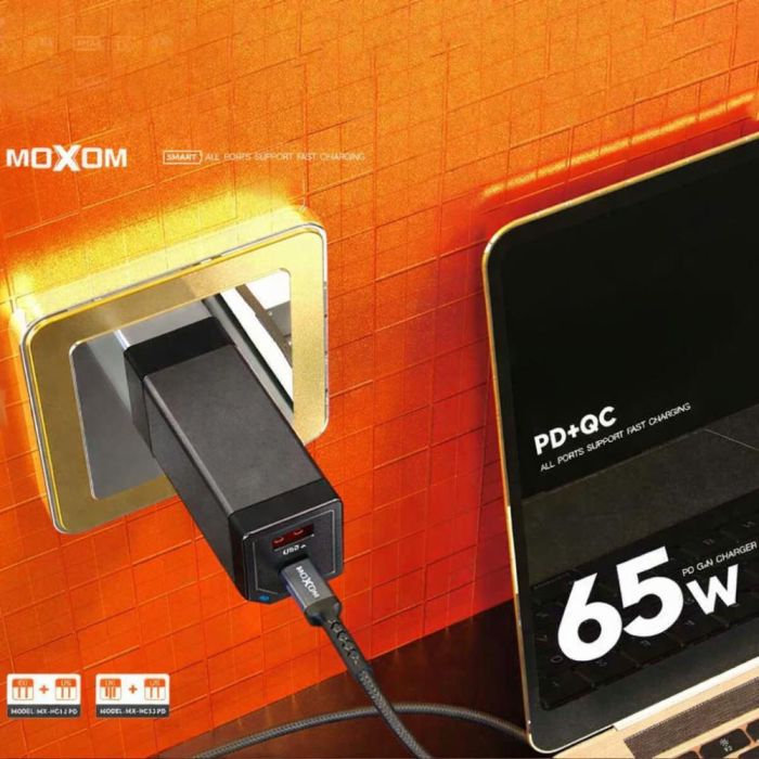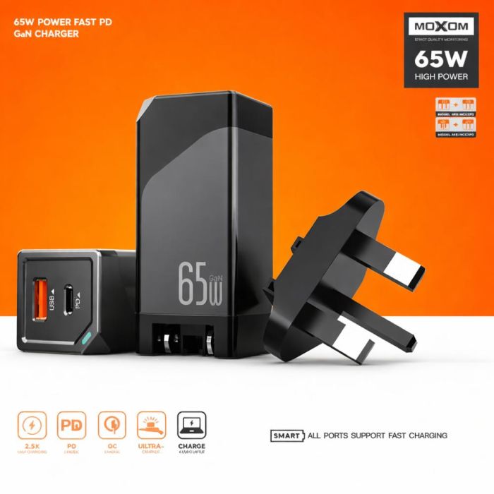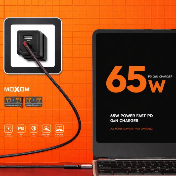 • شاحن حائط بتقنية GaN فائق السرعة 65 واط PD مع منفذ USB-C ومنفذ USB-A من Moxom