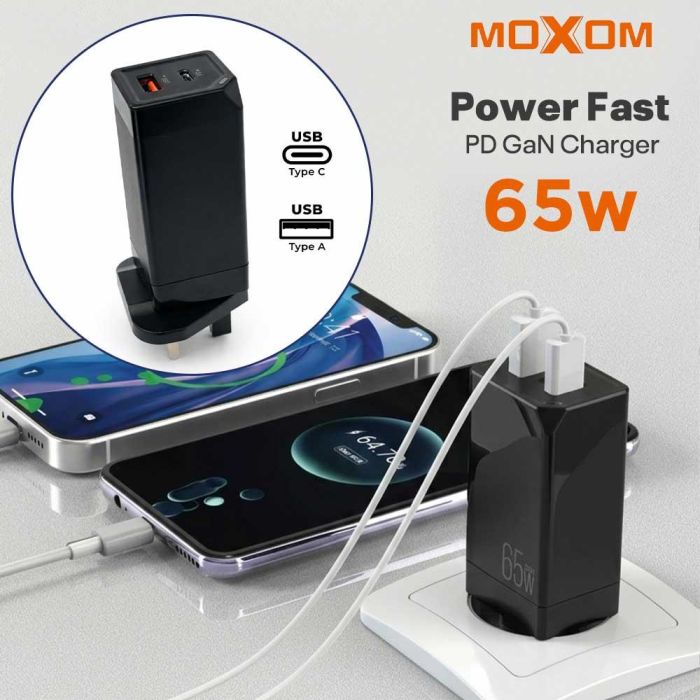 شاحن حائط بتقنية GaN فائق السرعة 65 واط PD مع منفذ USB-C ومنفذ USB-A من Moxom
