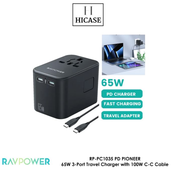- شاحن سفر 3 مخارج قوة 65 واط مع كيبل Type-C بقوة 100 واط من RAVPower