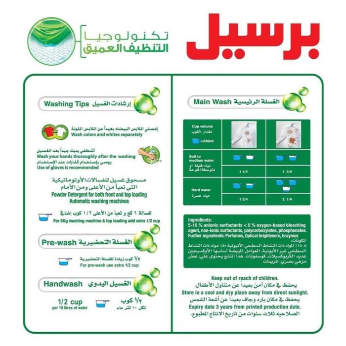 - تركيبة برسيل بتقنية ألمانية تمنحك نظافة فائقة بفضل ملايين جزيئات إزالة البقع الفريدة