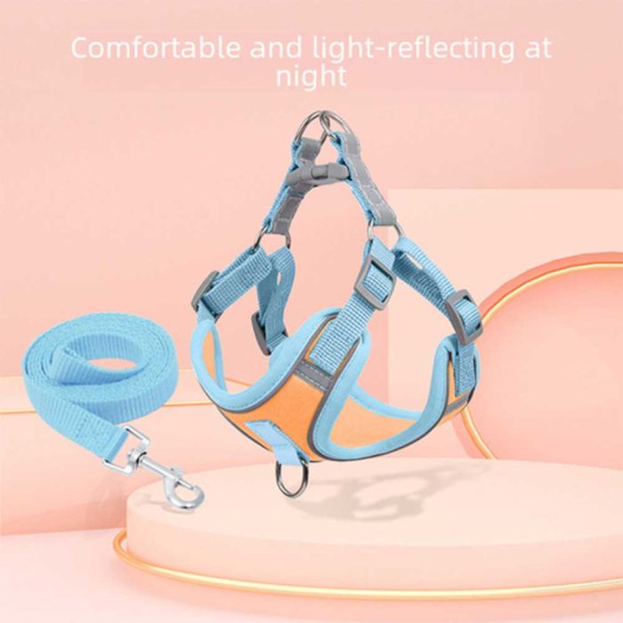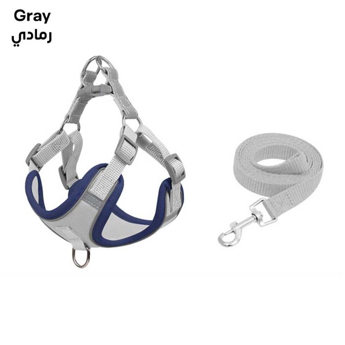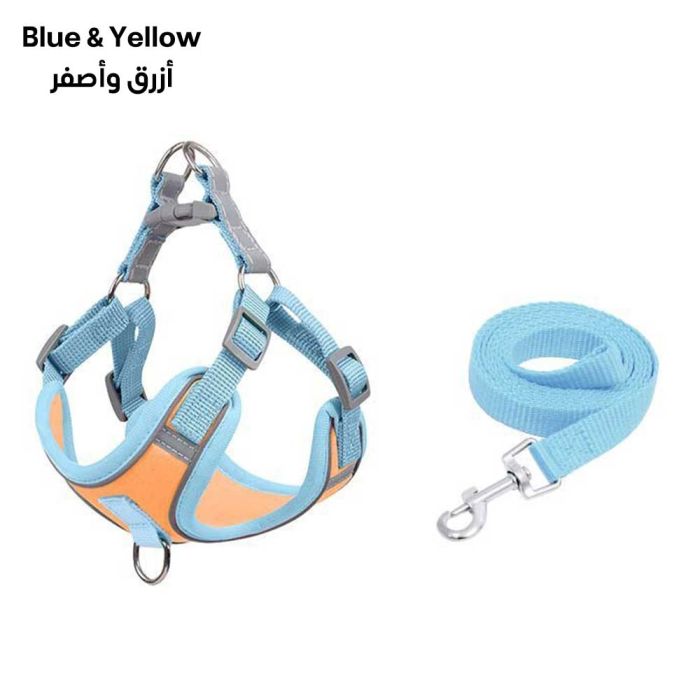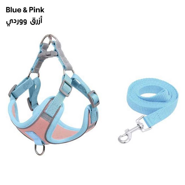 طقم حبل وسرج للكلاب والقطط مصنوع من نسيج شبكي متين وقابل للتنفس، يوفر تحكماً آمناً ومريحاً أثناء المشي، يوزع الضغط بلطف على صدر الحيوان الأليف