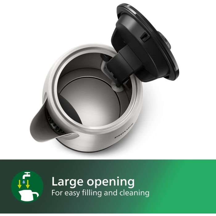 - الميزات: عنصر تسخين مسطح، أقدام غير قابلة للانزلاق، غطاء بفتحة واسعة، فوهة سهلة التعبئة، مقبض مريح