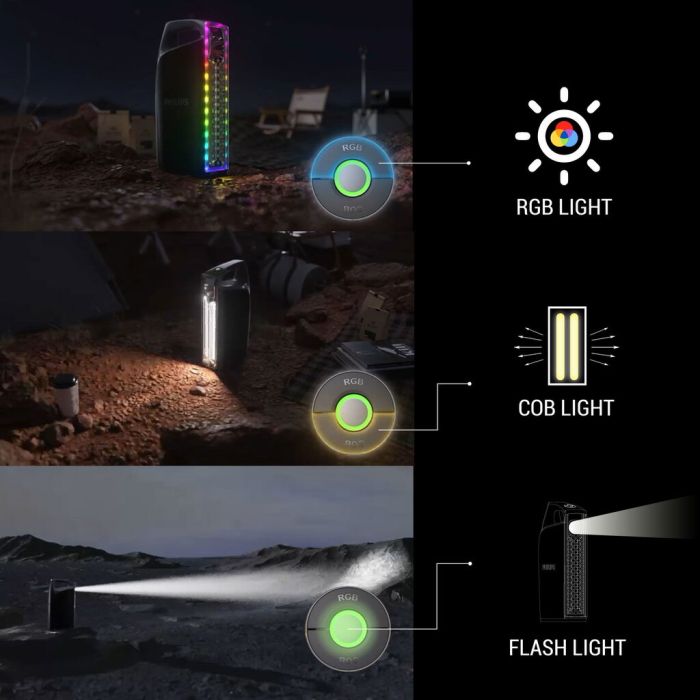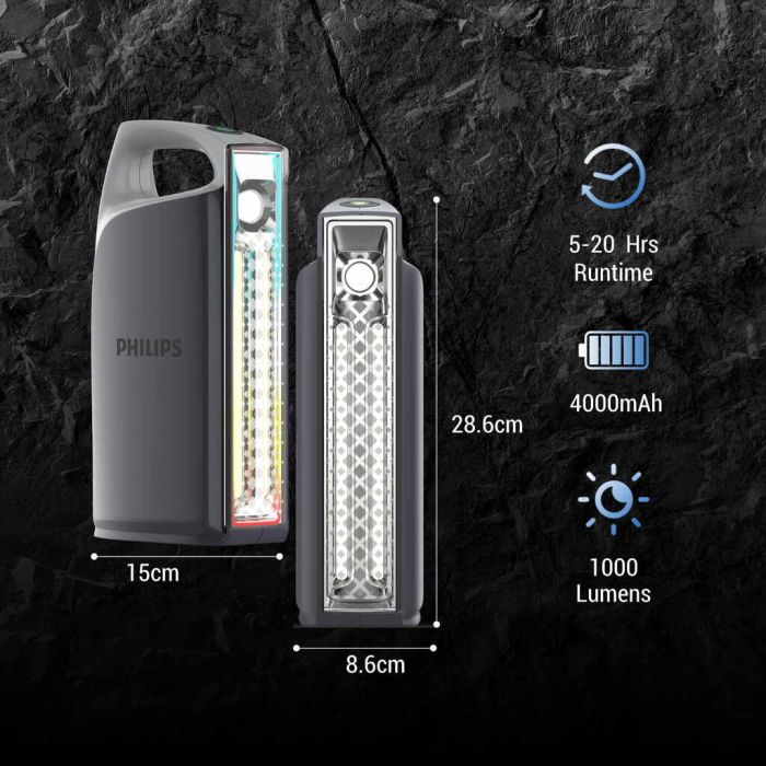أضئ أي مكان مع مصباح فيليبس متعدد الوظائف والقابل للشحن. يتميز بقوة 1000 لومن وشعاع ضوئي يصل إلى 100 متر، كما يتميز بمصباح COB ساطع وإضاءة RGB ثابتة/ديناميكية نابضة بالحياة لأجواء مميزة. مع بطارية تدوم طويلاً سعة 4000 مللي أمبير، وشحن سهل عبر USB-C، وتصميم متين ومحمول، يعد حل الإضاءة الأمثل 3 في 1 للتخييم، وحالات الطوارئ، أو لإضافة لمسة من الألوان إلى أي مساحة.