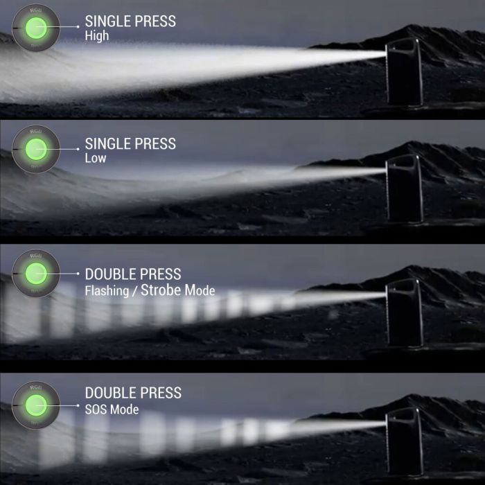 - الأوضاع: مصباح يدوي، فانوس COB، RGB