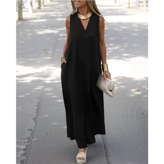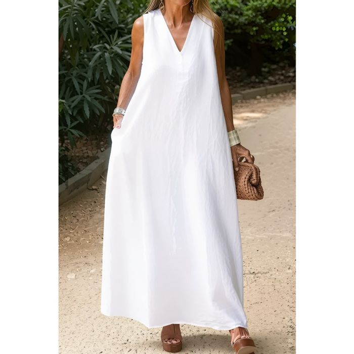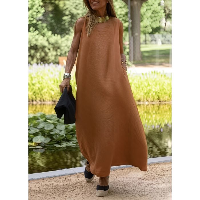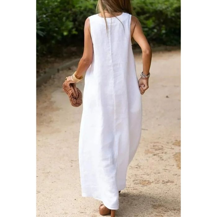 - فستان كتان سادة بدون أكمام وياقة على شكل حرف V للسيدات