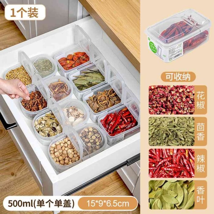 علبة تخزين توابل 500 مل مصنوعة من بلاستيك آمن للطعام، تساعدك على حفظ التوابل بشكل منظم ومرتب، غطاء محكم يحافظ على النكهة، وتصميم عملي يناسب الاستخدام اليومي داخل الأدراج والمطبخ