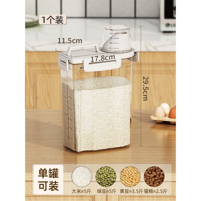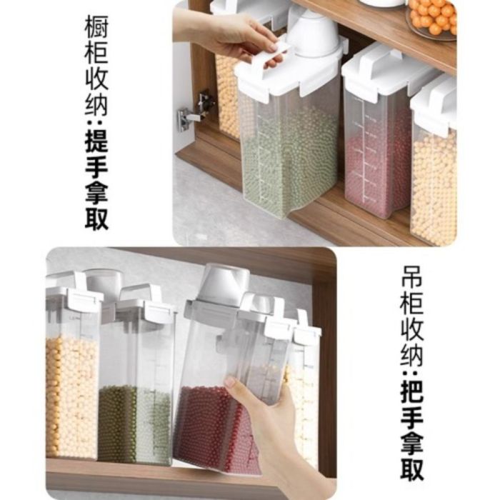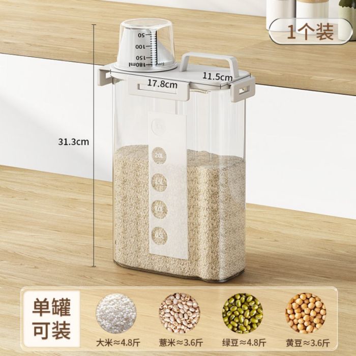علبة تخزين حبوب بلاستيك مزود بميزان مصنوعة من بلاستيك شفاف آمن للأغذية، بتصميم محكم يمنع الرطوبة والحشرات، مزودة بمؤشر قياس واضح يساعد على التحكم في الكمية ويحافظ على جودته داخل المطبخ