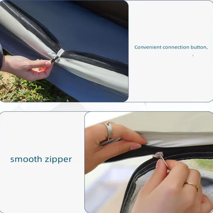 مصنوعة من بوليستر وقماش أكسفورد 210D، وتوفر هذه الخيمة الراحة والتهوية في الطقس المشمس. تحتوي على إغلاق بسحاب لسهولة الاستخدام، وتدعمها دعامة قوية من مادة PVC لتعزيز الثبات. مقاومة للماء ومثالية للأيام الممطرة كما توفر الحماية من أشعة الشمس المباشرة