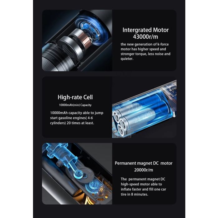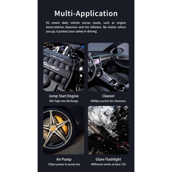 - الوظائف: ضوء LED، ، شاشة رقمية، وظيفة تشغيل السيارة، وظيفة المكنسة الكهربائية، وظيفة ضاغط الهواء، وظيفة مصباح يدوي، بطارية احتياطية