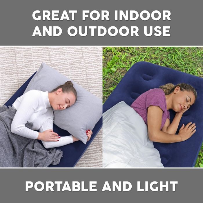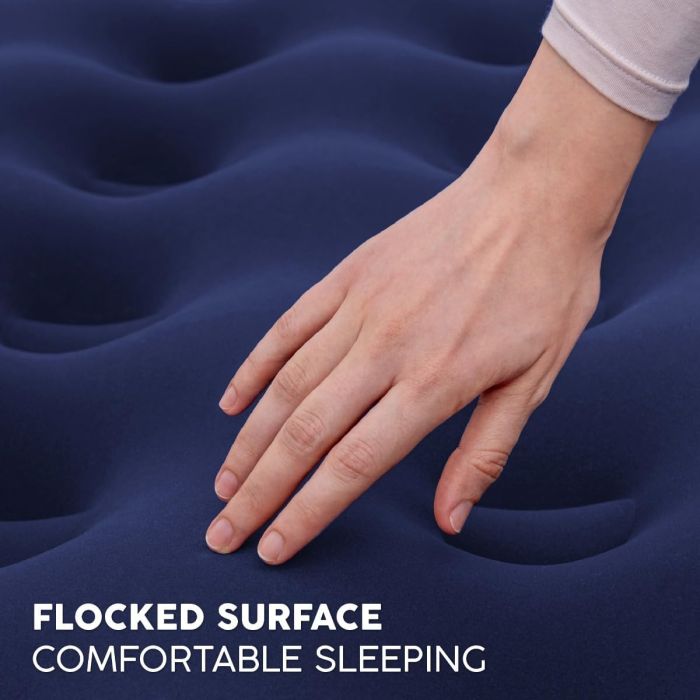 فرشة نوم هوائية تم تصميمها لتوفر الراحة والاسترخاء، بفضل سطحها الناعم المخملي، فهي تمدك بمساحة رحبة لتجربة نوم مريحة ودافئة وهادئة، سواء تم استخدامها في المخيم أو للترحيب بالضيوف، فهي توفر حلاً مريحاً ومتنقلاً للنوم. تم تصميمها باحترافية لتدعم الجسم في كافة الأوضاع وتوفير الراحة للعمود الفقري وإبقائه مستقيماً حسب حالة النوم. مدعمة بأجود أنواع الأقمشة المطرزة الناعمة للغاية واللطيفة على البشرة