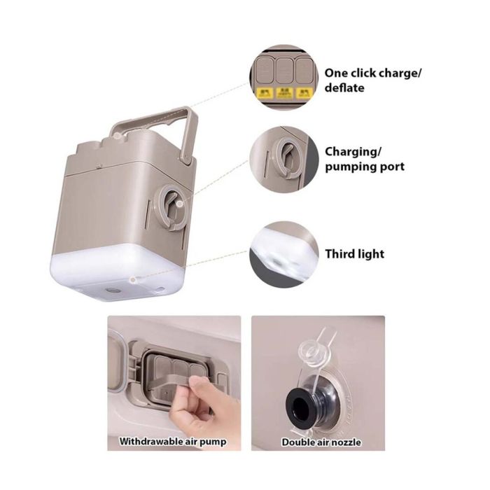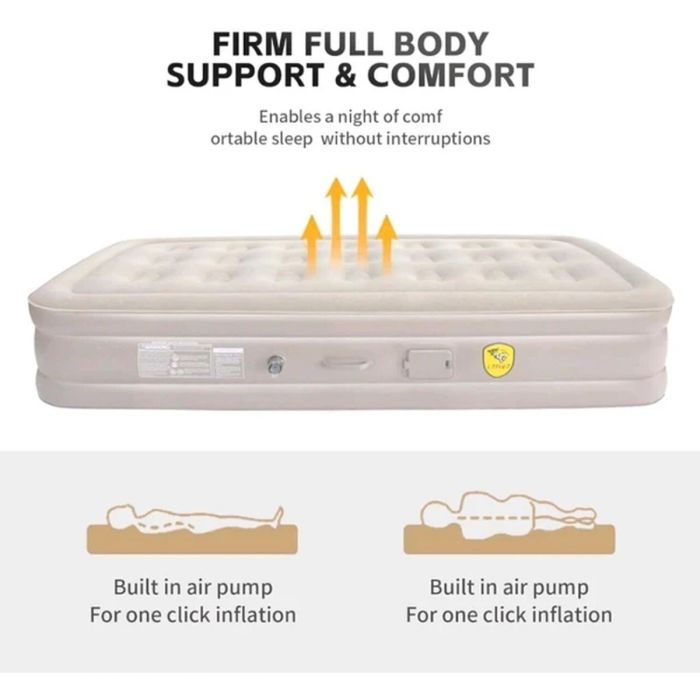 استمتع بالراحة في أي مكان مع هذه المرتبة الهوائية الفاخرة المصممة لتجمع بين السهولة والمتانة والاستخدام المتعدد. مزودة بمضخة قابلة للشحن بسعة 4000 مللي أمبير، يمكنها النفخ أو التفريغ في 4 دقائق فقط بضغطة زر، مما يجعل إعدادها أو تخزينها سريعًا وبسيطًا. مصنوعة من مواد سميكة مقاومة للماء مع سطح مخملي مريح، وتوفّر دعماً قويًا وتخفيفًا للضغط وتقليلًا للضوضاء أثناء النوم. تصميمها القابل للطي والخفيف يجعلها سهلة الحمل والتخزين، مثالية للرحلات والتخييم أو لاستقبال الضيوف. كما يمكن استخدام المضخة لنفخ عناصر أخرى مثل الكراسي الهوائية وحلقات السباحة والمسابح القابلة للنفخ، وتحتوي على ضوء مدمج مثالي للاستخدام الخارجي.