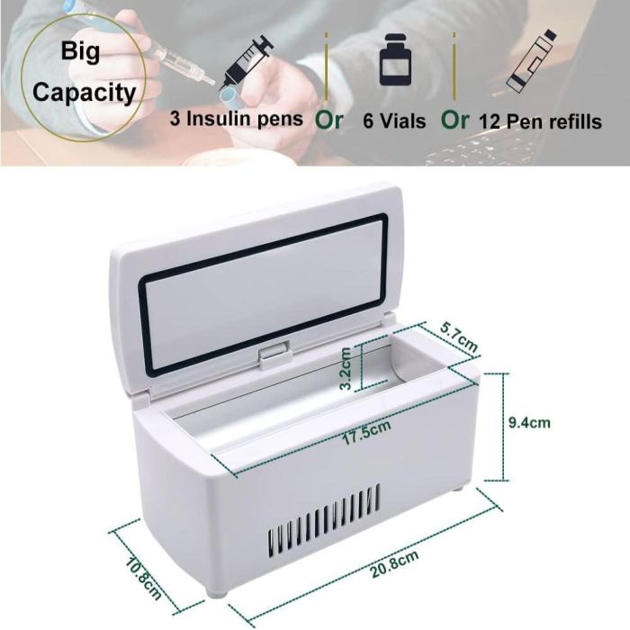 - السعة: تكفي 3 أقلام إنسولين أو 6 قوارير أو 12 عبوة قلم