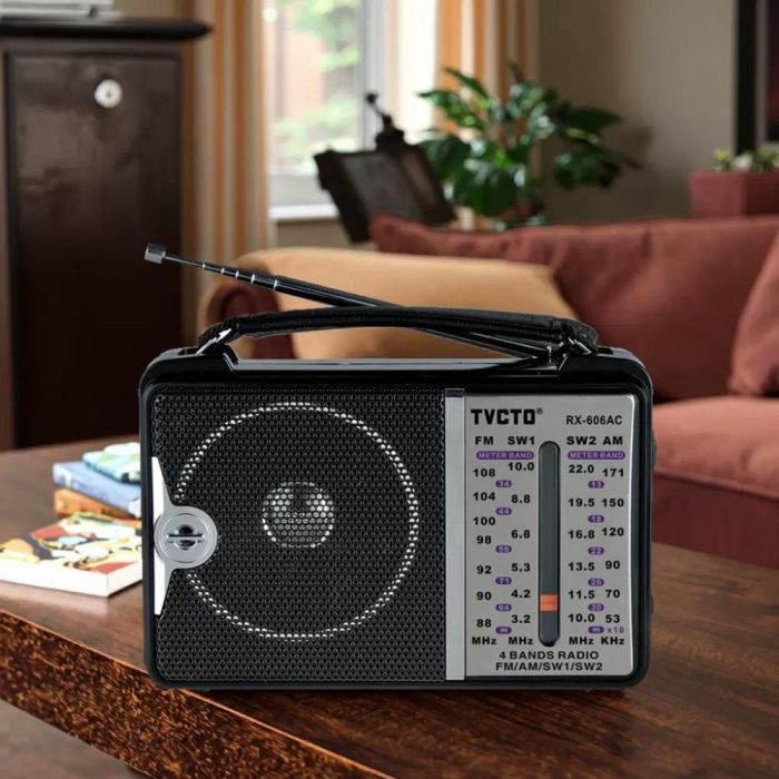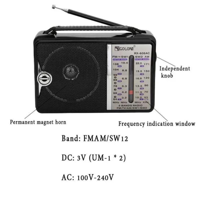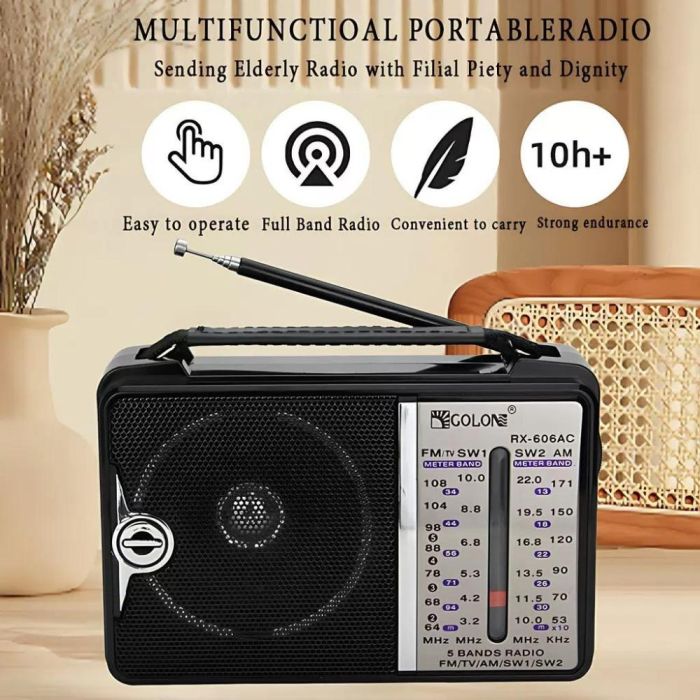 راديو محمول صغير الحجم يدعم FM وAM وSW، مع صوت واضح وتصميم عملي مثالي للمنزل والسفر والنشاطات الخارجية.