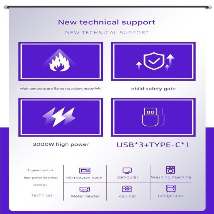 - عدد المخارج: 8 منافذ كهربائية + 3 USB-A + 1 Type-C