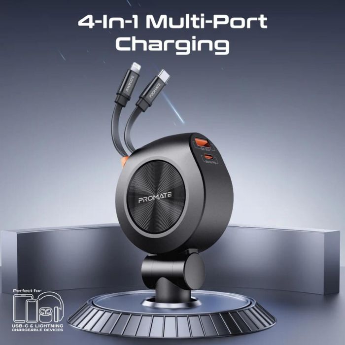 - شاحن سيارة متعدد المنافذ قوة 88 واط مزود ب 2 كابل USB-C قابل للسحب من Promate