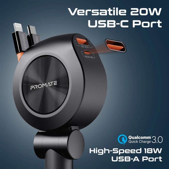 شاحن سيارة متعدد المنافذ قوة 88 واط مزود ب 2 كابل USB-C قابل للسحب من Promate