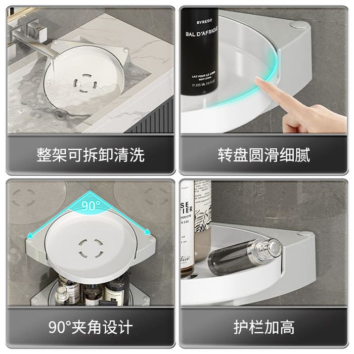 رف زاوية حمام دوار بدون حفر قطعة واحدة مصنوع من بلاستيك ABS المتين، يمنح تخزيناً أنيقاً للزاوية، تصميم دوار 360 درجة يسهل الوصول، تثبيت ثابت يحافظ على جودته، مناسب لمنتجات العناية اليومية