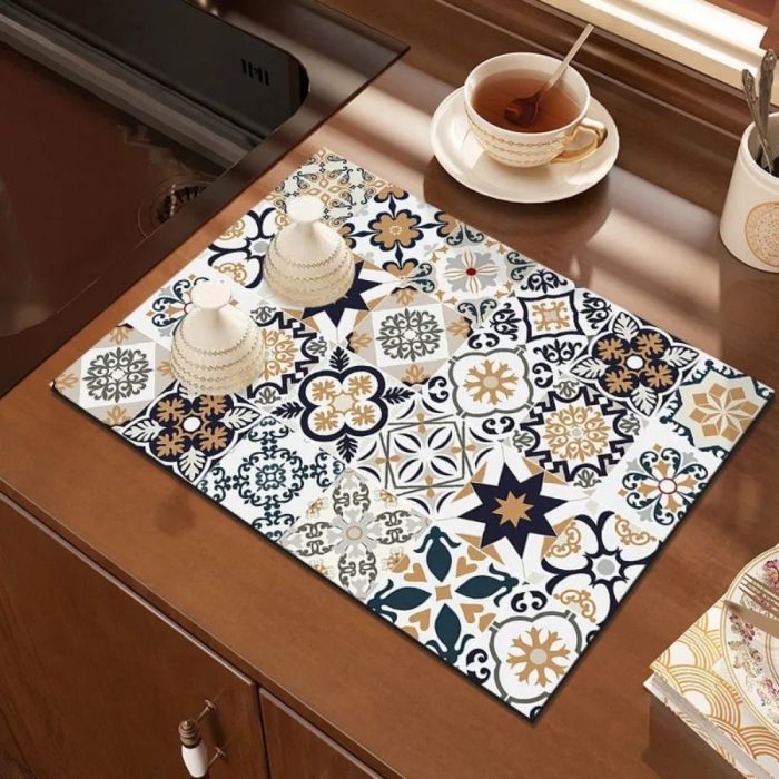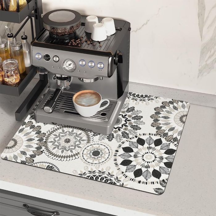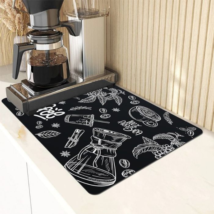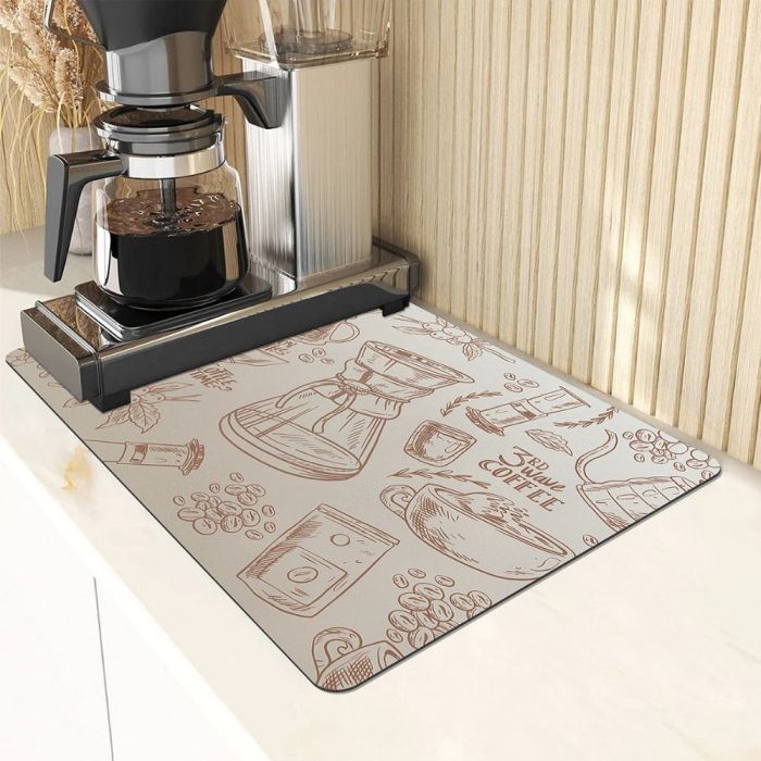 حصيرة ماكينة قهوة سريعة الجفاف مصنوعة من سطح امتصاصي مع قاعدة مطاط عازل، تساعد على تجفيف السوائل بسرعة، تحمي الطاولة من الحرارة والرذاذ، وتمنح ثباتًا أنيقًا لماكينة القهوة