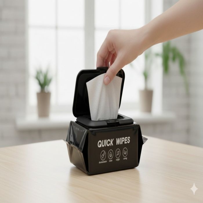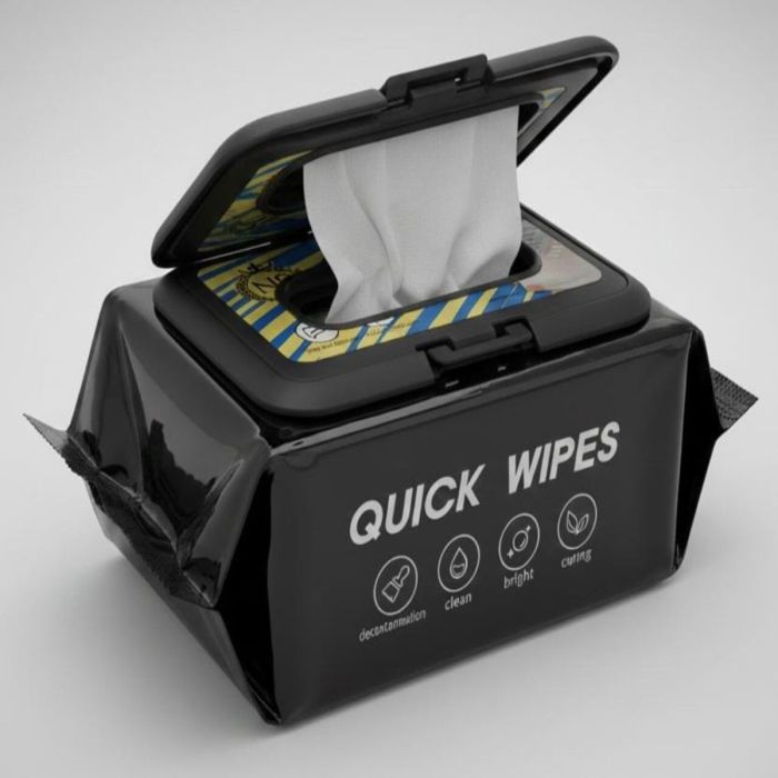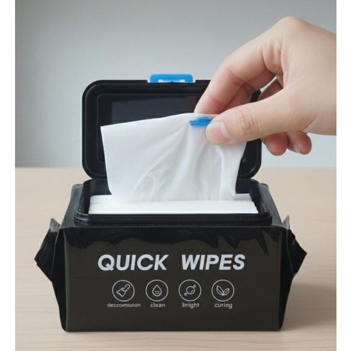 - مناديل مبللة مسبقاً مصممة للتنظيف السريع والعملي.