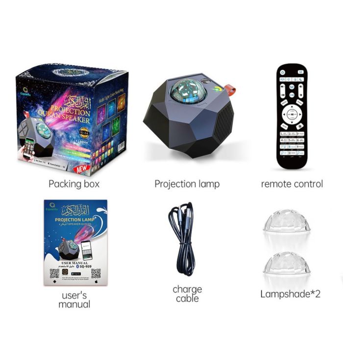 يتجاوز هذا المكبر بتقنية البلوتوث مجرد تشغيل الصوت العادي، ليمنحك اتصالاً عميقاً بإيمانك وعرضاً ضوئياً ساحراً. انغمس في آيات القرآن الكريم مع تلاوات لـ 18 قارئاً من أشهر القراء. اختر من بين 14 لغة مختلفة. اختر من بين 8 أوضاع إضاءة رائعة. تحكم بشكل كامل في مصباح العرض والصوت باستخدام جهاز التحكم عن بُعد المرفق أو تطبيق الهاتف الذكي سهل الاستخدام.